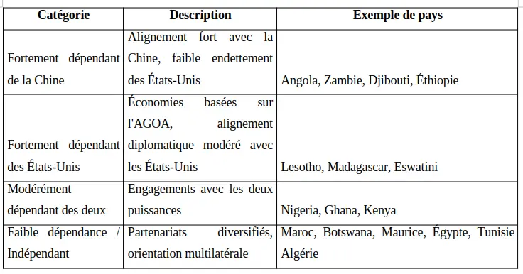 L’Éthiopie se démarque comme le seul pays africain fortement dépendant à la fois de la Chine et des États-Unis, plusieurs autres acteurs clés — notamment le Nigeria, le Ghana et le Kenya — entretiennent des relations modérées tant avec la Chine qu’avec les États-Unis, ce qui leur confère une grande flexibilité stratégique. Leur capacité à coopérer avec les deux puissances sans tomber dans une dépendance totale offre un modèle pour les États africains souhaitant éviter de se retrouver pris dans les rivalités entre grandes puissances.