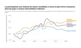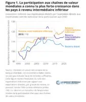 Aujourd’hui, plus de la moitié du commerce mondial s’effectue de manière indirecte via les CVM. Cette dynamique est particulièrement marquée dans les pays à revenu intermédiaire de la tranche inférieure (figure 1). La participation aux chaînes de valeur offre de nombreux avantages : elle accélère la croissance de la productivité et la création d’emplois.