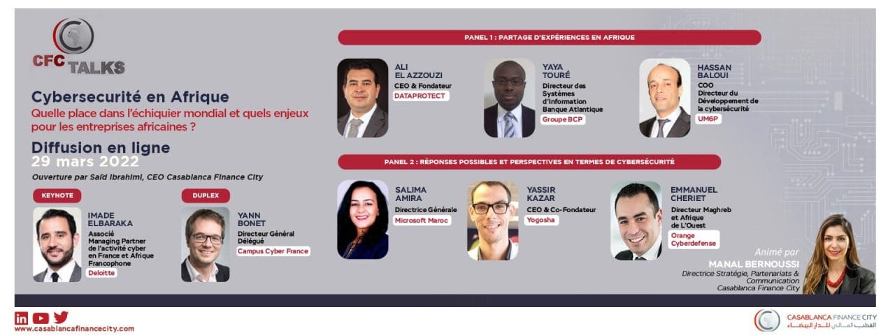 Au-delà des seules dimensions technologiques, l’agenda cyber du continent passe par une meilleure sensibilisation, une formation ciblée des talents ainsi qu’une collaboration inclusive impliquant l’ensemble des parties prenantes, a-t-il ajouté. Ibrahimi a également affirmé que l’Afrique admet un potentiel considérable en matière de digital business qu’il faudrait protéger via la cybersécurité relevant, à ce titre, la multiplication du nombre de licornes africaines, du boom du e-commerce et des services e-gov ou encore de l’enseignement à distance et de l’adoption croissante du télétravail. En ce qui concerne l’état des lieux de la cybersécurité en Afrique, Imade El Baraka, associé chez Deloitte et managing partner de l’activité cyber pour la France et l’Afrique francophone, a souligné dans son intervention en Keynote, que le continent, au même titre que le reste du monde, est concerné par les enjeux et défis cyber à la fois sur les plan économique et numérique. Après avoir noté une prise de conscience récente chez les entreprises africaines, M. El Baraka a estimé que cette manifestation de conscience devrait se traduire par des investissements concrets à la fois sur le volet des technologies et des plateformes, du facteur humain et des stratégies pilotées par le top management des entreprises. Les piliers au développement d’une souveraineté africaine en cyber, tributaire de la souveraineté économique continentale, seraient ainsi l’élaboration de stratégies, la sensibilisation des entreprises aux sujets de la cybersécurité ainsi que la formation de talents pour l’émergence d’experts cyber africains au service de l’Afrique. Pour leur part, les panélistes se sont accordés à relever la recrudescence des attaques cyber en Afrique, de plus en plus méthodiques et sophistiquées, lesquelles ont été amplifiées ces deux dernières années en raison du recours massif à la technologie digitale. A l’instar de M. El Baraka, le panel d’experts composé du Directeur du développement de la cybersécurité à l’UM6P, Hassan Baloui, du Directeur des systèmes d’information à Banque Atlantique, Yaya Touré, et du Fondateur de DataProtect, Ali El Azzouzi, a signalé la pénurie de ressources humaines en cybersécurité au sein du continent. Les experts ont, à ce titre, mis en lumière l’effet de la crise sanitaire sur l’accroissement des besoins en ressources jeunes auxquelles il faudrait dispenser des formations ciblées et en adéquation avec les besoins des économies africaines. Le véritable défi, selon eux, réside dans la réalisation d’une souveraineté numérique continentale via la consolidation de la coopération panafricaine en la matière. Ce webinaire a également été l’occasion pour le Directeur général délégué du Campus cyber, Yann Bonnet, de présenter cette nouvelle structure inaugurée à Paris en 2022, et qui vise à fédérer l’écosystème cyber pour mieux faire face à la menace et promouvoir l’excellence aux niveaux français et international. Notant l’amplification de la menace cyber qui fait partie du Top dix des risques du World Economic Forum dont le coût est évalué à près de 6.000 milliards de dollars, et le quadruplement des attaques en France, Bonnet a indiqué que « face aux mutations nous avons besoin de joindre nos efforts au niveau de l’écosystème pour mieux faire face à la menace ». Les trois axes de travail du Campus reposent sur la promotion des talents, l’innovation et la riposte, a-t-il ajouté. Lancés en 2021, les CFC Talks visent à donner des perspectives africaines et un retour d’expérience terrain aux investisseurs locaux et internationaux qui souhaitent étendre leurs activités sur le continent. Place financière engagée pour l’avenir du continent, CFC, contribue, via sa communauté de 200 entreprises opérant dans 50 pays, à changer la perception des investisseurs sur l’Afrique.