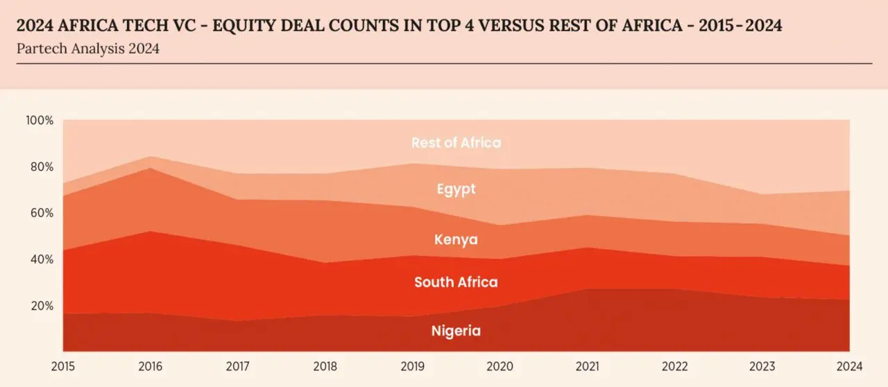 Les quatre principaux pays – le Nigeria, l’Égypte, le Kenya et l’Afrique du Sud – continuent de dominer le marché africain du capital-risque. Ensemble, ils représentent 67 % du total des financements en actions en 2024, contre 79 % en 2023 et 72 % en 2022. Ce déclin de la part de marché des quatre leaders montre une certaine redistribution des investissements à l’échelle continentale. Néanmoins, ces pays restent des acteurs incontournables, non seulement en termes de volume de financement mais également en nombre de transactions.