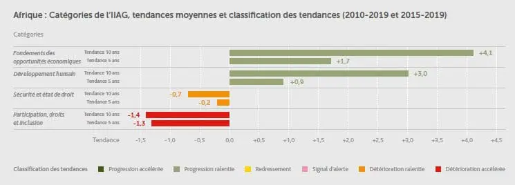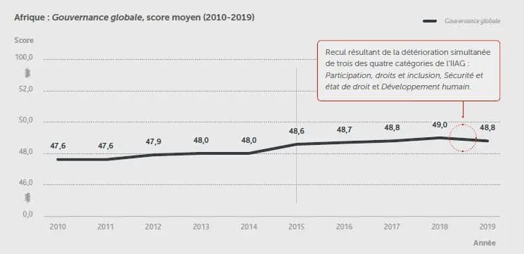 Sur l’ensemble du continent, l’IIAG connait en 2019 une baisse de 0,2 par rapport à 2018, une première en dix ans. Cette baisse s’explique notamment par une dégradation des scores enregistrés par les pays du continent dans les catégories citées plus haut. Elle confirme la tendance observée depuis l’année 2015 et une dégradation notée en particulier dans la catégorie participation, droit et inclusion. En effet, même si l’on retrouve les taux de croissance les plus élevés du monde sur le continent, il faut reconnaitre que celle-ci n’est pas toujours inclusive et que les disparités restent fortes entre les différentes classes sociales. Par ailleurs, cette dégradation peut s’expliquer également par une palette plus étendue des sources de collectes en 2019 (+5) ainsi que des variables utilisées (+45).