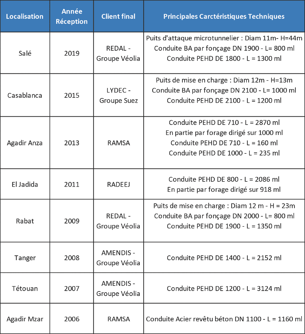 Au Maroc, la SOMAGEC a déjà travaillé sur la plupart des émissaires en mer comme celui de Mzar au sud d’Agadir en 2004, de Tétouan en 2007, de Tanger en 2008, de Rabat en 2009, d’El Jadida en 2011 ou encore de Sidi Bernoussi à Casablanca en 2014 (voir tableau). « Maintenant que les grandes villes côtières marocaines sont presque toutes équipées de systèmes de dépollution et les rejets marins sont déjà réalisés, SOMAGEC poursuit son développement dans la réalisation des ouvrages de prises d’eau de mer dans le cadre des projets de dessalement », souligne Roger Sahyoun, Président du Groupe