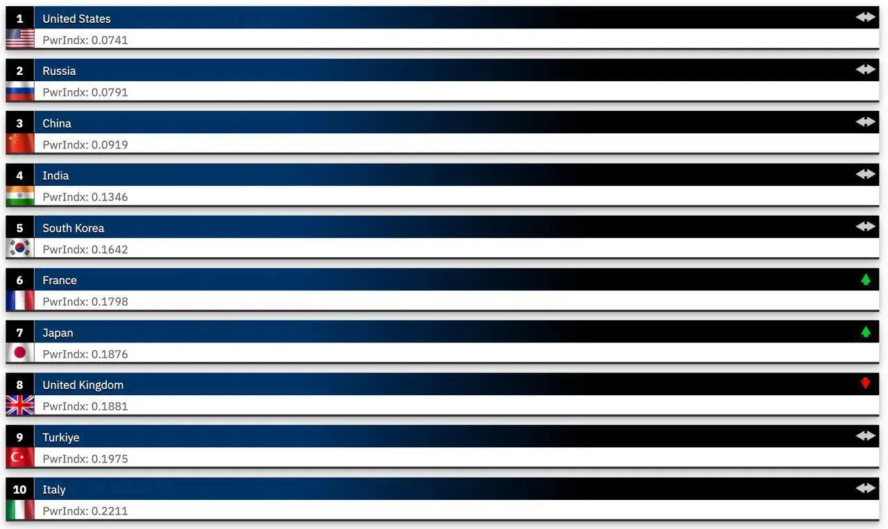 Les trois armées les plus puissantes au monde sont celles des États-Unis (PowerIndex : 0,0741), de la Russie (0,0791) et de la Chine (0,0919). L’année dernière, les États-Unis occupaient également la première place, tandis que la Russie et la Chine partageaient la deuxième.