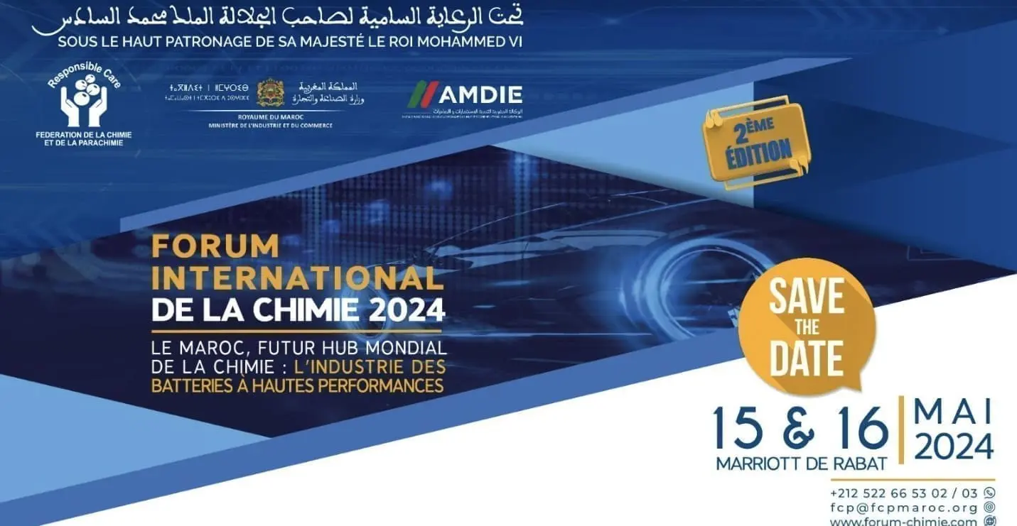La Fédération de la Chimie et de la Parachimie (FCP) annonce la deuxième édition du forum international de la chimie, Sous le Haut Patronage de Sa Majesté le Roi Mohammed VI, qui se tiendra à Rabat les 15 et 16 mai 2024, en partenariat avec le ministère de l’Industrie et du Commerce et l’Agence marocaine de Développement des investissements et des exportations(AMDIE)
