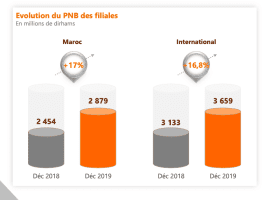 Cette belle performance a surtout été possible grâce aux filiales au Maroc, mais aussi à l’international. En effet, la croissance du PNB des filiales à l’international est de 16,8% tirée par un développement de l’activité́ et par l’impact de l’intégration de BCP Mauritius. Car, c’est la première année pleine de consolidation de cette filiale acquise en 2018. A cela s’ajoute aussi les nouvelles acquisitions au cours du dernier trimestre 2019, notamment la Banque Internationale du Cameroun, la Banque Commerciale Internationale (BCI) de la République du Congo.